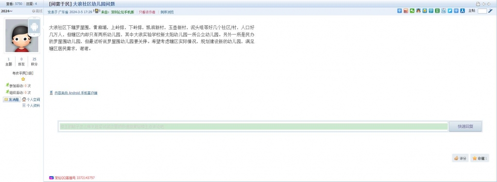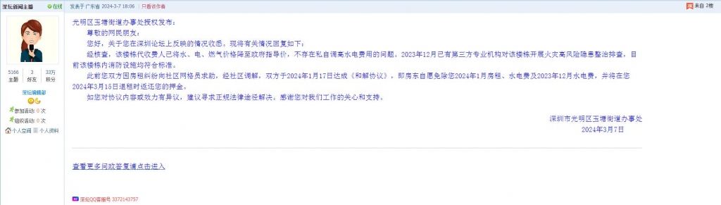据统计,2024年3月4日-3月10日,网友在深圳论坛发布问政类帖文共24篇,得到相关单位正式回应的帖文数为9篇,光明区回应率最高。