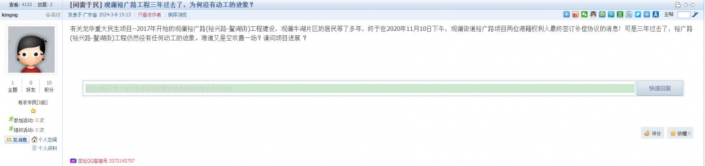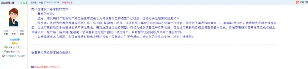 7、帖文《观澜裕广路工程三年过去了,为何没有动工的迹象?》
