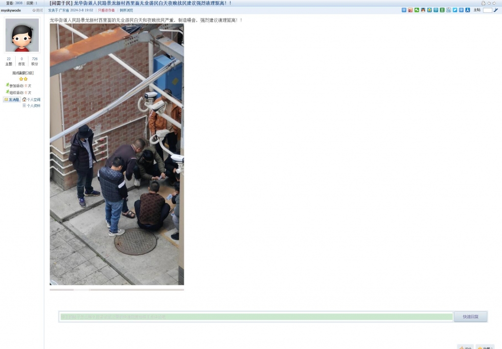 8. 帖文《龙华街道人民路景龙新村西里面无业游民白天夜晚扰民建议强烈清理驱离!!》