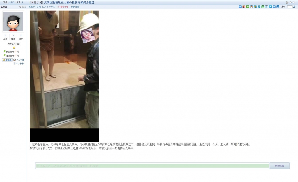 4、帖文《光明区勤诚达正大城公租房电梯安全隐患》