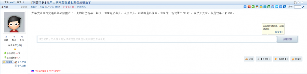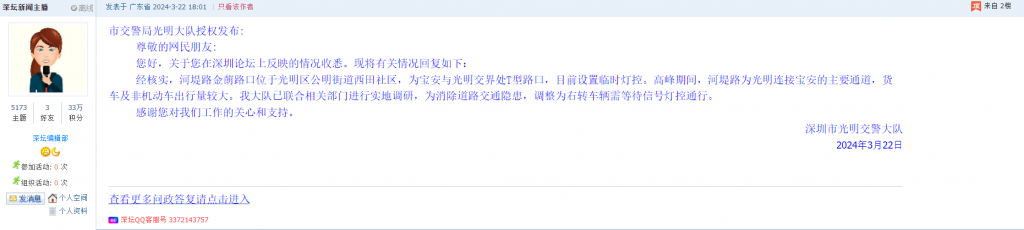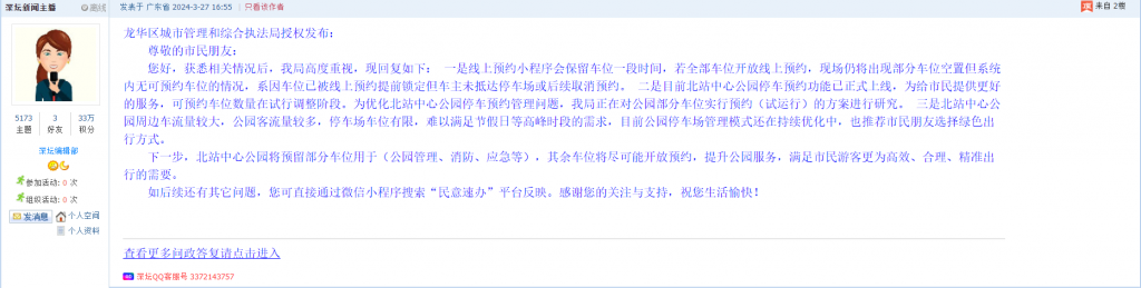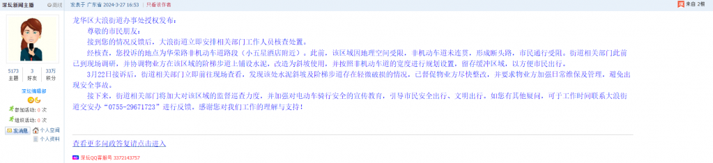 各职能单位如需对网友反映的问题进行回应,可在深圳论坛注册官方账号并通过认证,回帖进行回应。