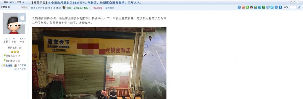 1、帖文《宝安福永凤凰北区68栋万*达便利店,长期聚众通宵赌博,三年之久。》