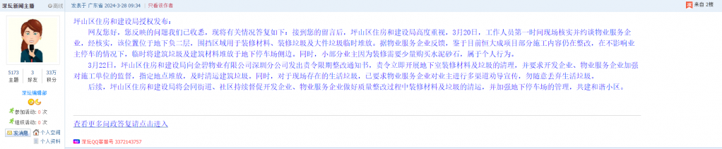 3月22日,坪山区住房和建设局向金碧物业有限公司深圳分公司发出责令限期整改通知书,责令立即开展地下室装修材料及垃圾的清理,并要求开发企业、物业服务企业加强对施工单位的监督,指定地点堆放,及时清运建筑垃圾。同时,对于现场存在的生活垃圾,已要求物业服务企业对业主进行多渠道劝导宣传,勿随意丢弃生活垃圾。