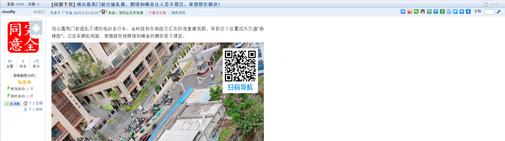9、帖文《观山嘉苑门前交通乱像,拥堵和噪音让人苦不堪言,希望帮忙解决!》