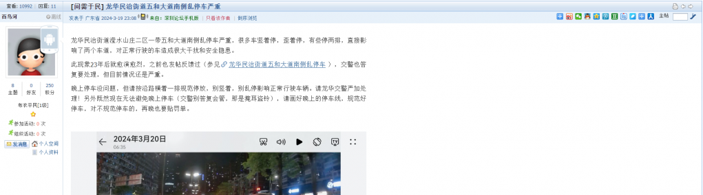 11、帖文《龙华民治街道五和大道南侧乱停车严重》