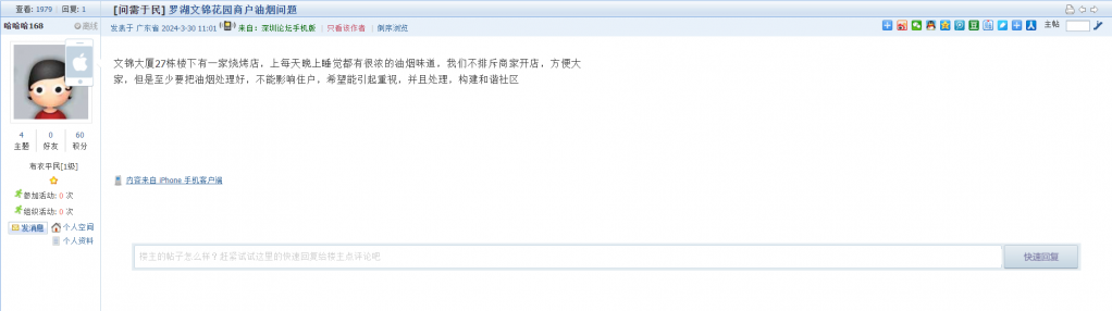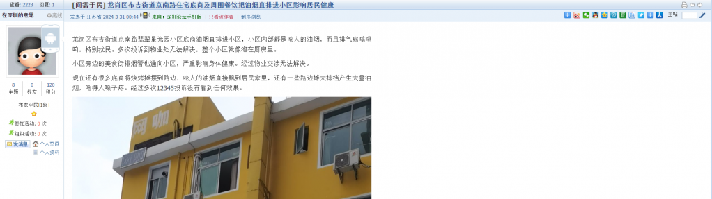7、帖文《龙岗区布吉街道京南路住宅底商及周围餐饮把油烟直排进小区影响居民健康》