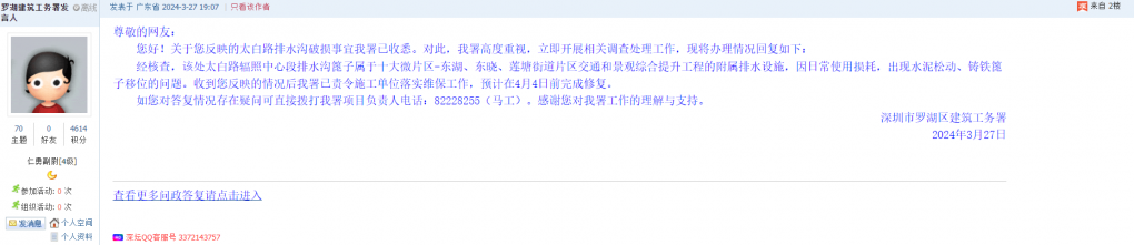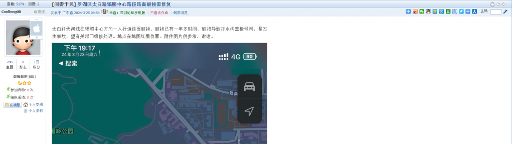 1、帖文《罗湖区太白路辐照中心路段路面破损需修复》