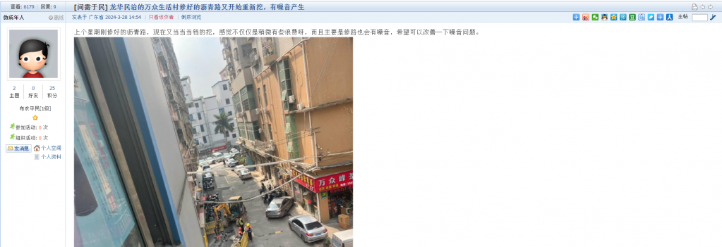 10、帖文《龙华民治的万众生活村修好的沥青路又开始重新挖,有噪音产生》