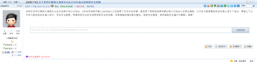 14、帖文《关于龙华区梅坂大道滢水山庄公交车站台违停的安全问题》