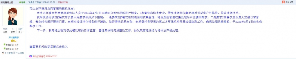 收到问题后,布吉街道高度重视,立即对网友反映的情况进行核实。2024年4月7日,街道执法部门到达现场进行核查,该处两家餐饮店均正在营业,因两家餐饮店未将油烟收集至高空,直接向店外排放对周边住户造成影响。执法人员现场要求两家餐饮店负责人对其进行整改,一是要求深圳市龙岗区阿萍美味餐饮店加装油烟净化设备。二是要求两家餐饮店加装油烟收集管道,将油烟经管道收集处理后引至楼顶排放。三是要求两家餐饮店负责人加强日常管理,营业时关闭好厨房门窗,定期对油烟净化设备进行清洗,做好清洗记录台账,定期委托有资质的第三方环保机构开展油烟监测工作,确保油烟达标排放。