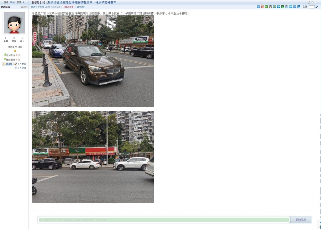 9、帖文《龙华民治民安路金地梅陇镇有违停,导致早高峰塞车》