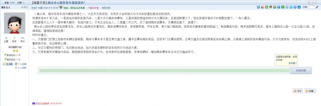 11、帖文《南山中心路炸街车游荡扰民!》