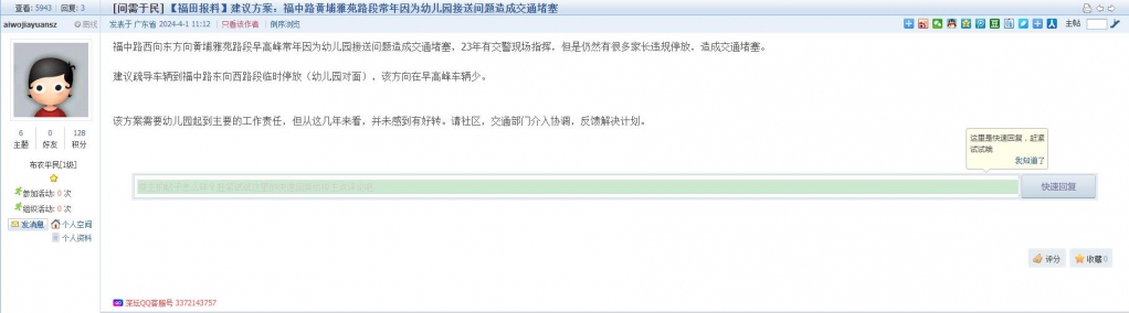 4、帖文《【福田报料】建议方案:福中路黄埔雅苑路段常年因为幼儿园接送问题造成交通堵塞》