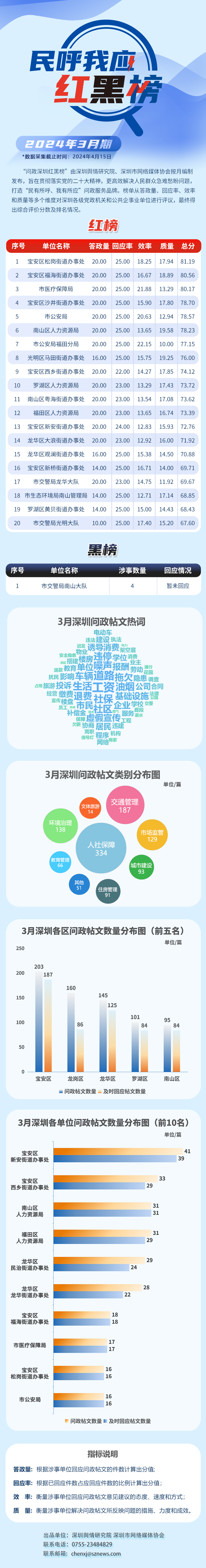 2024年3月,共有20家单位因积极开展网络答政工作,赢得群众的支持与认可,最终登上“红榜”,它们分别是:宝安区松岗街道办事处、宝安区福海街道办事处、市医疗保障局、宝安区沙井街道办事处、市公安局、南山区人力资源局、市公安局福田分局、光明区马田街道办事处、宝安区西乡街道办事处、罗湖区人力资源局、南山区粤海街道办事处、福田区人力资源局、宝安区新安街道办事处、龙华区大浪街道办事处、龙华区观澜街道办事处、宝安区新桥街道办事处、市交警局龙华大队、市生态环境局南山管理局、罗湖区黄贝街道办事处、市交警局光明大队。另外,市交警局南山大队因相关帖文回应率偏低,整体答政效果不佳,被列入了“黑榜”。