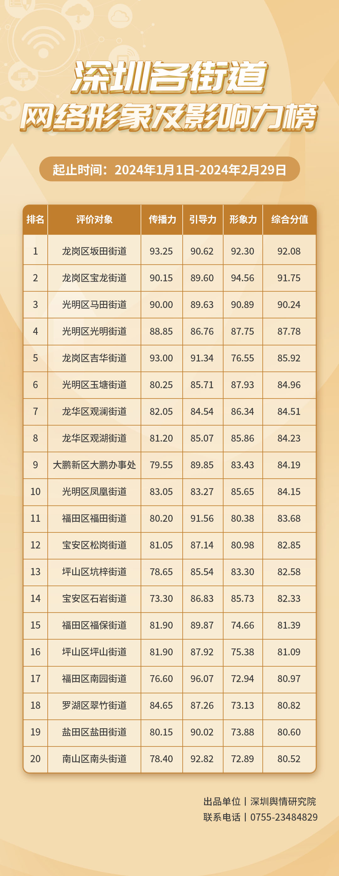 《深圳各街道网络形象及影响力榜》从深圳各街道的传播力(100分)、引导力(100分)、形象力(100分)三个维度展开综合评价、计分排名,最终形成榜单。