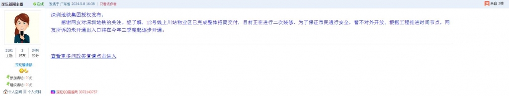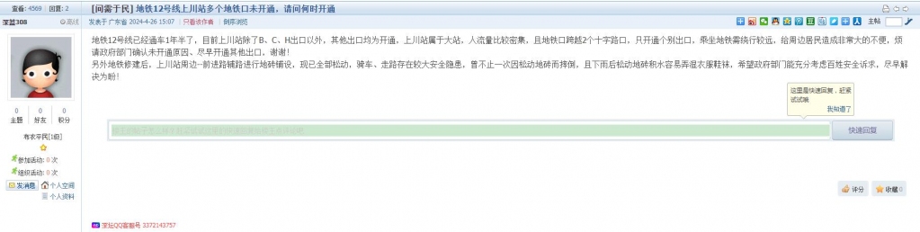 15、帖文《地铁12号线上川站多个地铁口未开通,请问何时开通》