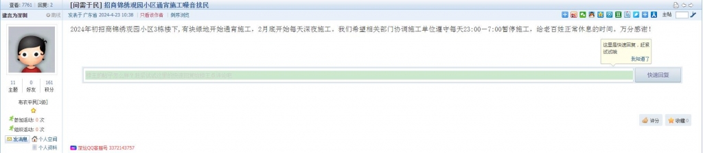 3、帖文《招商锦绣观园小区通宵施工噪音扰民》