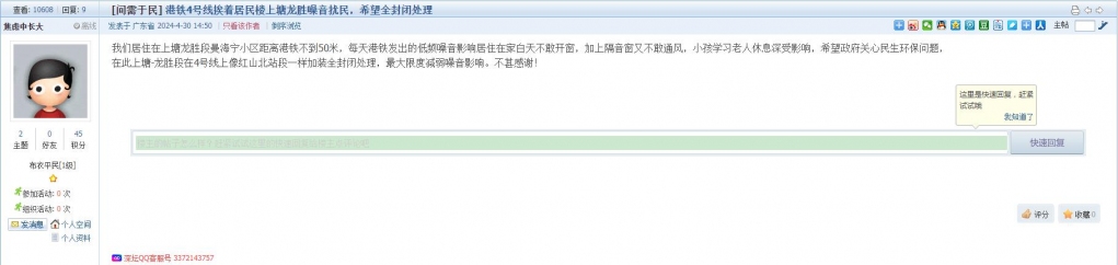 22、帖文《港铁4号线挨着居民楼上塘龙胜噪音扰民,希望全封闭处理》