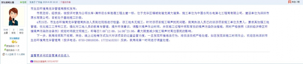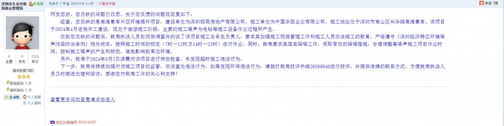 下一步,我局将采取不定期、突击、线上巡检等方式加大对该项目的巡查监管力度,一旦发现环境违法行为,将依法依规严格处理。如您发现非施工时间作业,欢迎您向深圳市生态环境局龙华管理局(投诉电话:0755-28019330、17722415253)反映,我局将第一时间进行调查处理。