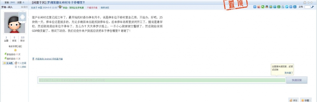 45、帖文《罗湖区东晓街道绿景社区稻花路占道违停谁能治?》