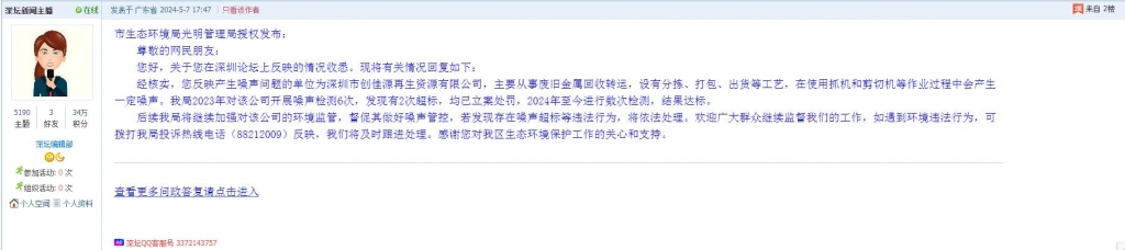 经核实,您反映产生噪声问题的单位为深圳市创佳源再生资源有限公司,主要从事废旧金属回收转运,设有分拣、打包、出货等工艺,在使用抓机和剪切机等作业过程中会产生一定噪声。我局2023年对该公司开展噪声检测6次,发现有2次超标,均已立案处罚,2024年至今进行数次检测,结果达标。
