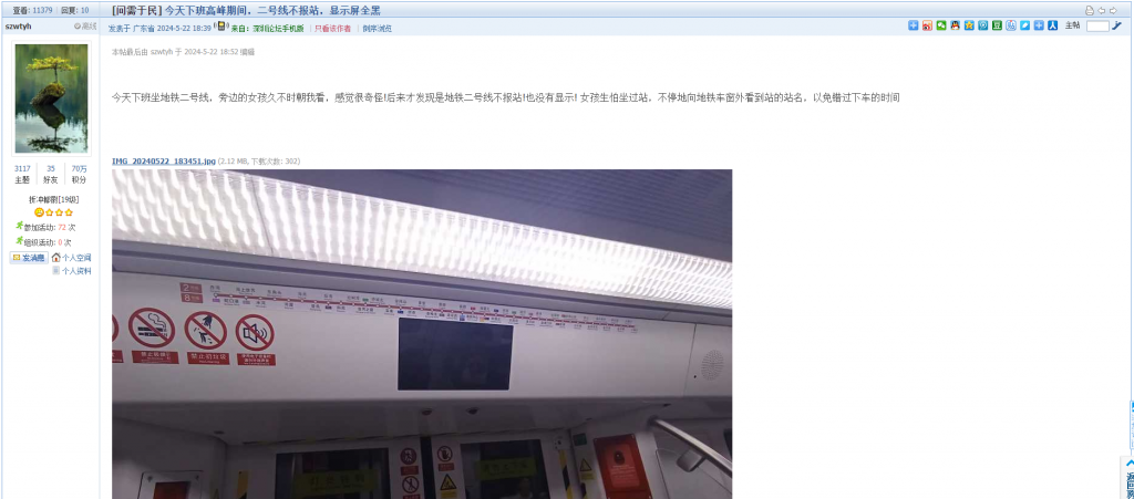21、帖文《今天下班高峰期间,二号线不报站,显示屏全黑》