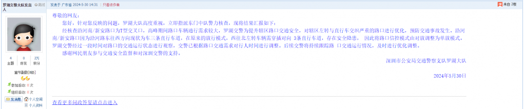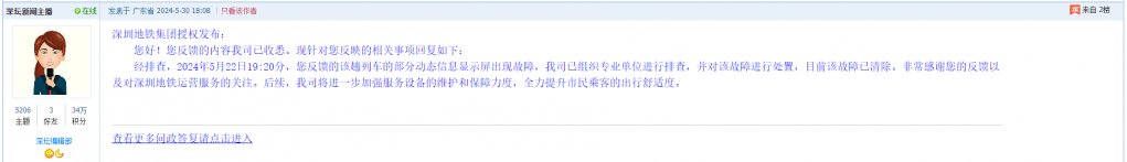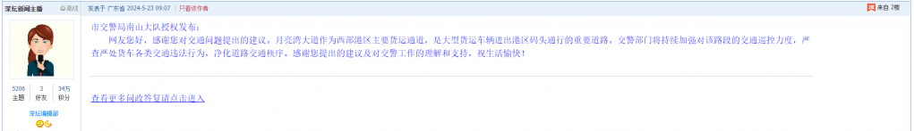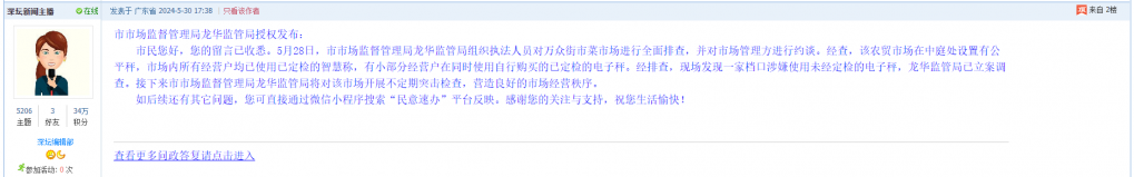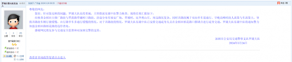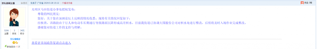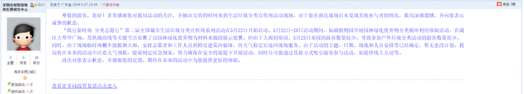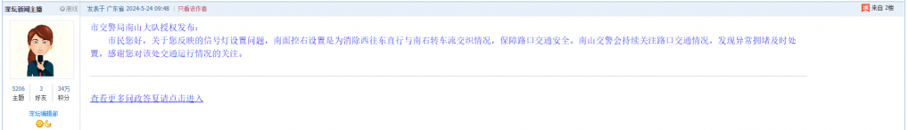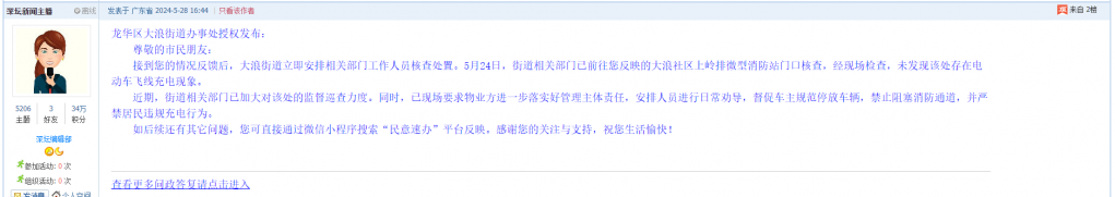 各职能单位如需对网友反映的问题进行回应,可在深圳论坛注册官方账号并通过认证,回帖进行回应。