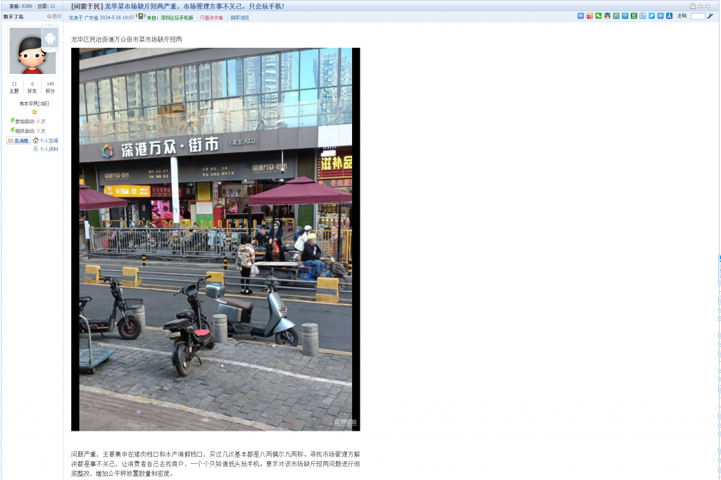 20、帖文《龙华菜市场缺斤短两严重,市场管理方事不关己,只会玩手机!》