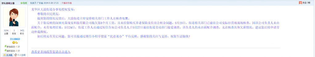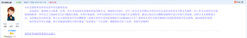 市民您好,您的留言已收悉。经查,该公司为深圳光量现实科技有限公司。2024年5月24日、27日工作人员多次拨打该单位经办人及法定代表人手机无人接听。经工作人员到单位注册地现场核查,该单位已于2024年3月15日搬离注册地。经查社保系统,该单位2024年2月至3月份拖欠社会保险费,我局已依法启动稽核追缴程序进行社保欠费追缴。因留言人未留联系方式,无法确定其具体诉求,留言人可到社保龙华分局稽核科(深圳市龙华区龙华街道御璟中心C栋505办公室)提供用人单位未依法缴纳社会保险费的相关佐证材料,我局将依法处理。如后续还有其它问题,您可直接通过微信小程序搜索“民意速办”平台反映。感谢您的关注与支持,祝您生活愉快!