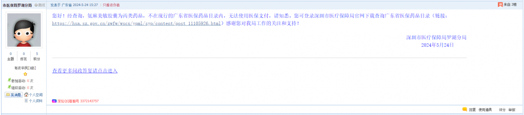 3、帖文《深圳医保不能报销氨麻美敏胶囊》