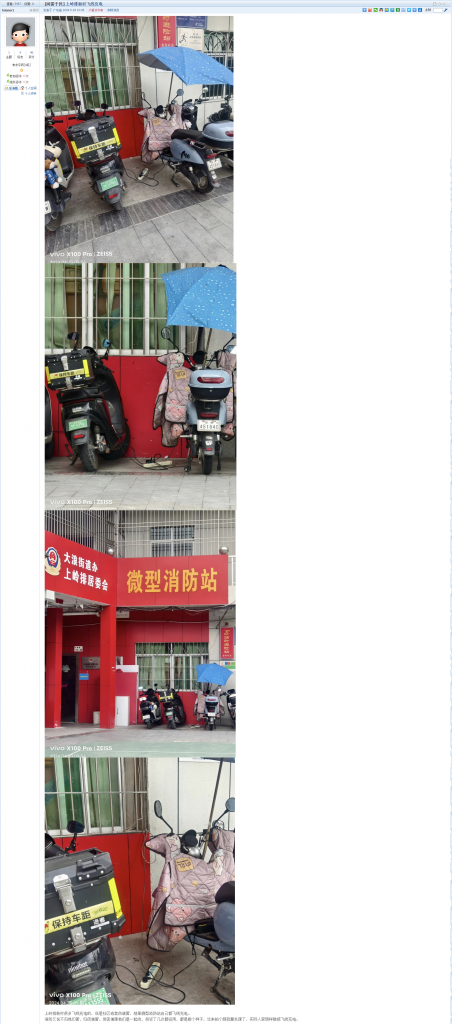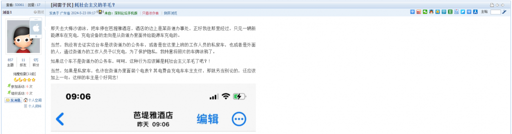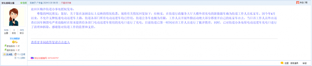 尊敬的网民朋友:您好,关于您在深圳论坛上反映的情况收悉。现将有关情况回复如下:经核实,在街道行政服务大厅大楼外部充电的新能源车确为街道工作人员私家车。因今年4月以来,不允许无牌低速电动巡逻车上路,街道各部门所有电动巡逻车均已停用,街道公务车也极为有限,工作人员开展外勤活动绝大部分都要开自己的私家车出去,当日该工作人员外出巡查后因车辆馈电严重故临时在原来提供给各部门电动巡逻车使用的充电口进行了充电。目前街道已第一时间对该工作人员进行了批评教育,同时,已对街道办各处原电动巡逻车充电口进行了清理和拆除。感谢您对街道工作的监督和支持。