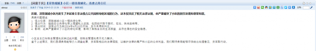 10、帖文《【深铁瑞城】小区一楼违规硬化,违建占用公区》