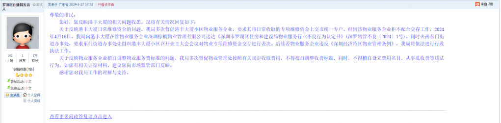 尊敬的市民:您好,您反映港丰大厦的相关问题收悉,现将有关情况回复如下:关于反映港丰大厦日常维修资金的问题,我局多次督促港丰大厦小区物业服务企业,要求其将日常收取的专项维修资金上交市统一专户。但因该物业服务企业拒不配合交存工作,2024年4月16日,我局向港丰大厦在管物业服务企业深圳棕榈物业管理有限公司送达《深圳市罗湖区住房和建设局物业服务行业不良行为认定书》(深罗物管不良〔2024〕1号)。同时去函东门街道办事处,要求东门街道办事处先组织港丰大厦小区召开业主大会会议对物业专项维修资金交存进行表决。后续若物业服务企业违反《深圳经济特区物业管理条例》,我局将依法进行行政执法工作。关于反映物业服务企业擅自调整物业服务费标准的问题,我局多次督促物业管理处按照有关规定收取费用,不得擅自调整收费标准,同时,不得擅自设立费用名目,从事乱收费等违法行为。如您有相关证据材料,建议您向市场监管部门反映。感谢您对我局工作的理解与支持。