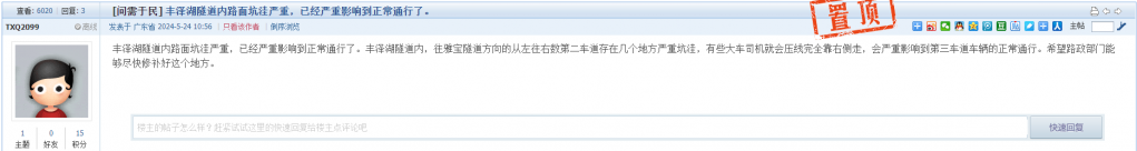 14、帖文《丰泽湖隧道内路面坑洼严重,已经严重影响到正常通行了》