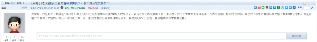 12、帖文《凶狠女主管恶意辞退男员工不发工资还软禁男员工》