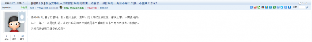 19、帖文《投诉龙华区人民医院打麻药的医生一边看书一边打麻药,而且不穿工作服,不佩戴工作证!》