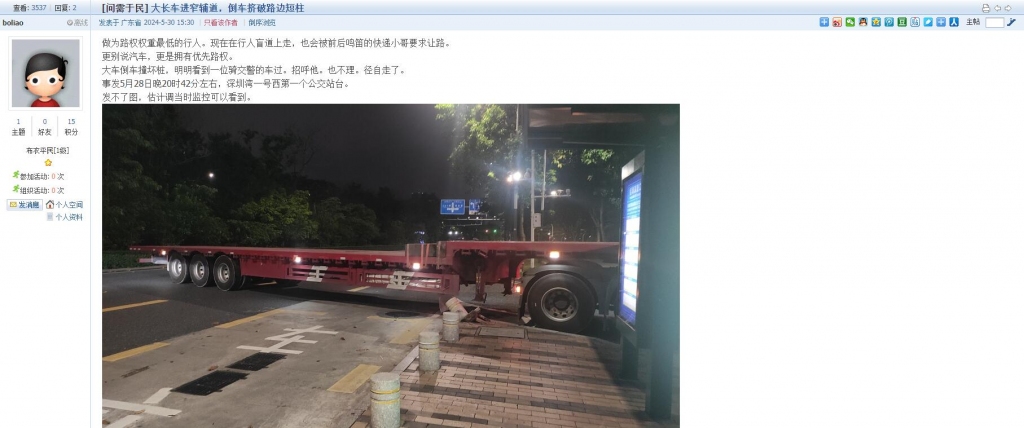 6、帖文《大长车进窄辅道,倒车挤破路边短柱》