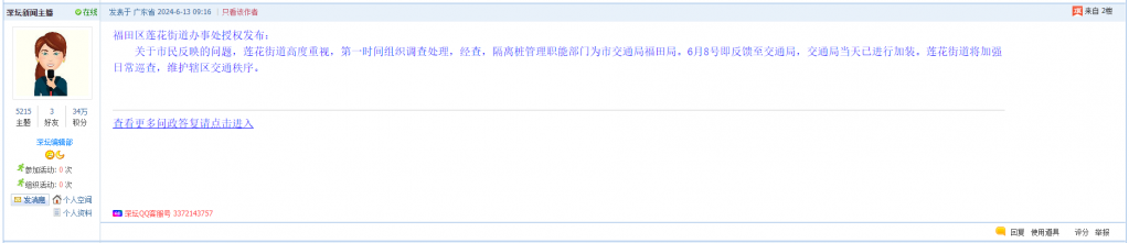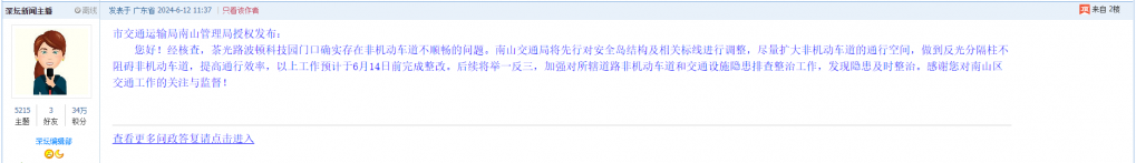 各职能单位如需对网友反映的问题进行回应,可在深圳论坛注册官方账号并通过认证,回帖进行回应。