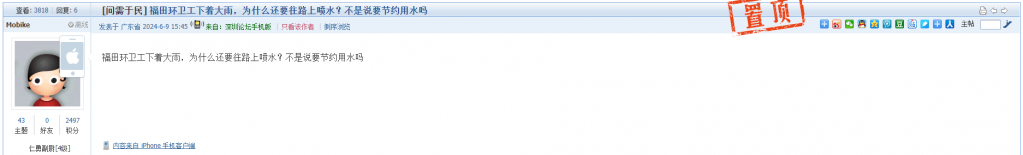 5、帖文《福田环卫工下着大雨,为什么还要往路上喷水?不是说要节约用水吗》