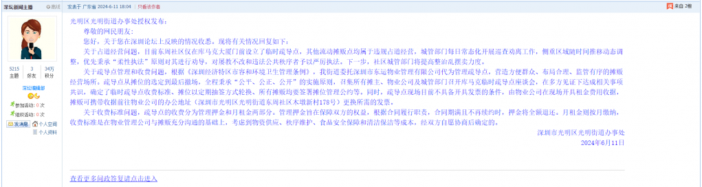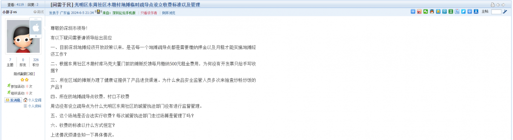 8、帖文《光明区东周社区木墩村地摊临时疏导点设立收费标准以及管理》