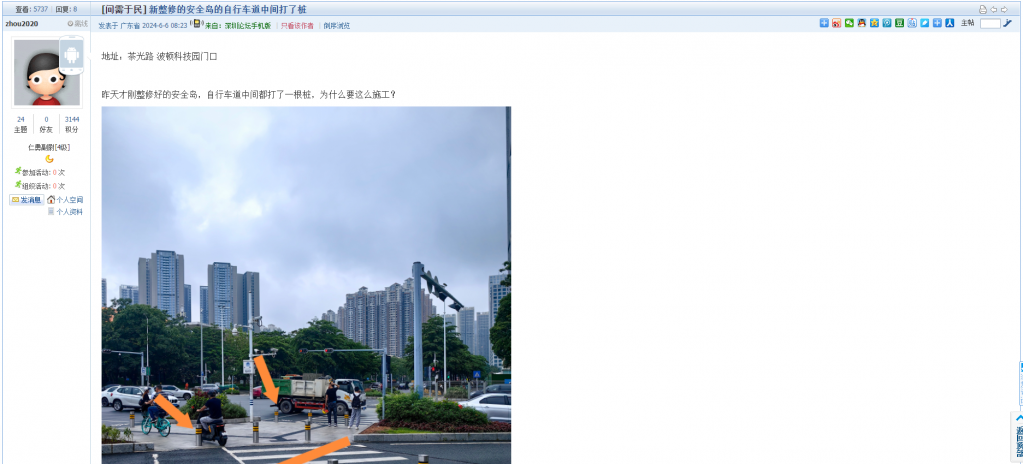 9、帖文《新整修的安全岛的自行车道中间打了桩》