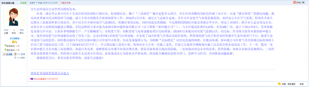 经查,满京华云著小区位于宝安区松岗街道松江路以北、松瑞路以东,属于“工改商住”城市更新单元项目,该小区西南侧均为松岗沙浦工业片区,出现“楼企相邻”的扰民问题。我局高度重视市民反映的涉气问题,成立专项小组数次开展现场督导工作。2024年1月以来,通过大气走航车走航,并在小区安装空气质量监测系统,实时显示小区空气质量;持续性开展不定期人工监测采样累计38余次,其中对小区开展环境空气监测5次,检测结果均达标。同时加强巡查溯源,不定期利用PID仪昼夜巡查满京华小区、周边工业园区,联合业主走访周边企业,对各位业主反映的问题进行溯源。市民反映的主要对象为深圳市新**德科技有限公司(以下简称“新**德公司”),与小区最近距离约110米,共有4栋厂房,成立于2011年6月,有环保批复及排污许可证,主要从事线路板生产,产生酸碱废气、有机废气等,均配套废气处理设施处理后达标排放。2024年以来我局对其废气监测11次,均达标。作为重点监管对象的新**德公司,现有28套废气治理设施均安装了用电工况,以及3套VOCs有机废气治理设施,并安装了24小时废气在线自动监控系统,所排放的废气因子浓度实时传输至生态环境部门平台,接受生态环境部门远程监控。同时我局夜间不定时对新**德公司开展突击检查,均未发现偷排行为。为缓解“达标扰民”对居民造成的困扰,经我局协调,新**德公司在废气多次检测达标的基础上启动了废气提标改造工程,已于2024年4月27日开工,并已制定施工进度计划,每周对业主公布一次施工进度,目前已完成部分楼栋地台施工以及部分废水池加盖工作。下一步,我局一是在新**德公司企业施工改造期间,加强日常巡查,提醒督促企业遵守环保法律法规,督促其按要求完成改造措施;二是加强对周边企业的巡查、监管措施,加密企业执法监测频次;三是持续落实值班值守制度,坚持每日安排专人巡查小区周边,如发现违法行为将依法严格处理;四是联合属地街道相关部门,发挥合力作用,共同推进问题化解。感谢您的关注,希望对您有所帮助,祝您生活愉快!