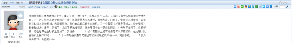 您好!您反映问题我们福田交警大队已收到,针对您反映的问题,我们现将情况反馈如下:一是机动车驾驶证期满换证业务是全国通办,办理方式有多种途径:(1)内地居民可前往就近的期满换证自助厅一站式办理驾驶人体检、拍照及机动车驾驶证期满换证业务;(2)到深圳市联网医院进行驾驶人体检后通过“交管12123”APP线上申请换证;(3)预约到全市各车管所和交警大队窗口现场办理。二是关于工作人员的服务态度问题,我们将会核实,对违反工作岗位要求的,我们将予以严肃处理。同时我们会进一步加强对工作人员的岗前培训,提高工作人员的服务技能及服务沟通能力。三是关于政策法规的发布问题,可以通过关注“深圳交警权威发布”公众号,实时在线上了解深圳交警发布的权威政策法规及办事指南。感谢您的监督和支持。