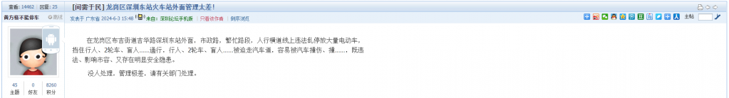 1、帖文《请市交通运输局罗湖管理局查金稻田路自行车乱停行为》