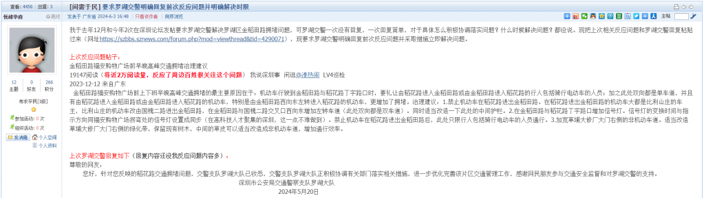 2、帖文《要求罗湖交警明确回复前次反应问题并明确解决时限》