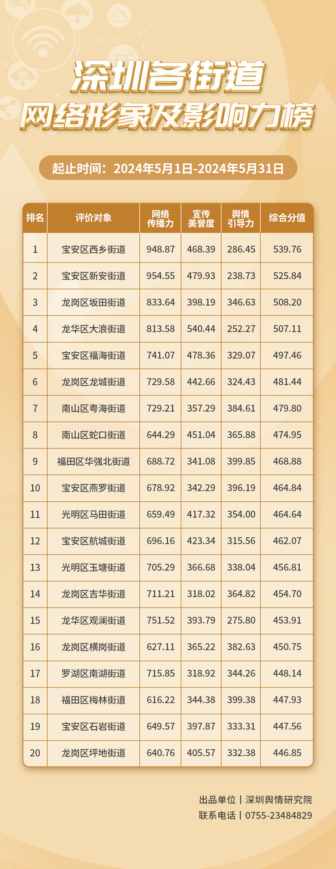 2024年5月,共有20个街道登上《深圳各街道网络形象及影响力榜》,分别是:宝安区西乡街道、宝安区新安街道、龙岗区坂田街道、龙华区大浪街道、宝安区福海街道、龙岗区龙城街道、南山区粤海街道、南山区蛇口街道、福田区华强北街道、宝安区燕罗街道、光明区马田街道、宝安区航城街道、光明区玉塘街道、龙岗区吉华街道、龙华区观澜街道、龙岗区横岗街道、罗湖区南湖街道、福田区梅林街道、宝安区石岩街道、龙岗区坪地街道。