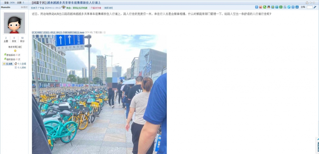 5、帖文《越来越越多共享单车密集堆放在人行道上》