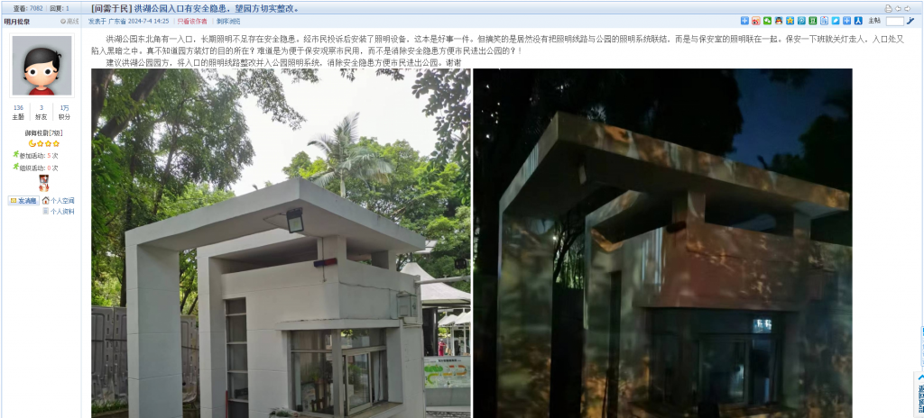 8. 帖文《洪湖公园入口有安全隐患,望园方切实整改。》