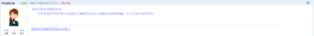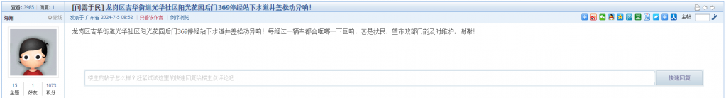 10. 帖文《龙岗区吉华街道光华社区阳光花园后门369停经站下水道井盖松动异响!》