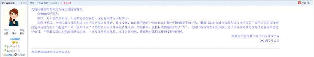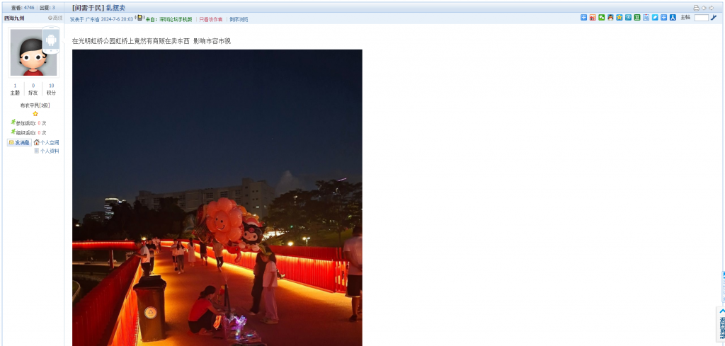 尊敬的网民朋友:您好,关于您在深圳论坛上反映的情况收悉。现将有关情况回复如下:接到投诉后,光明区城市管理和综合执法局立即进行核查,核实发现7月6日晚的确存一处市民在虹桥公园桥面摆卖的行为,根据《深圳市城市管理和综合执法局关于规范公园游园守则制定和使用有关工作的通知》第二条第11点“请勿擅自在园区开展经营性活动、散发传单、张挂标语横幅或户外广告”,光明区城市管理和综合执法局已结合合同及考核办法对管养单位进行处罚,并要求其后续加强虹桥沿线巡查,一旦发现乱摆卖现象,立即进行劝离。感谢您对我们工作的支持和理解。